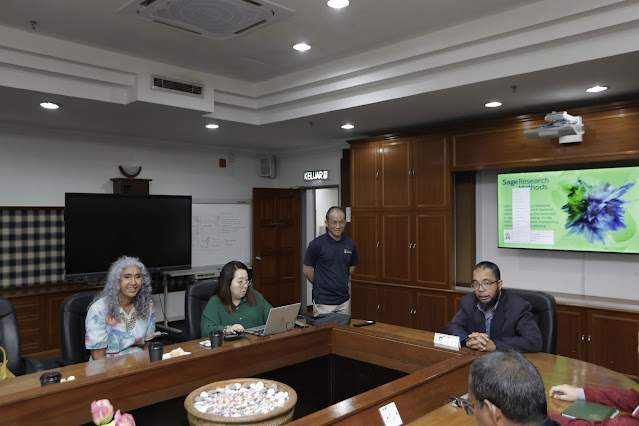 Rombongan disambut oleh Encik Mohd Razalli Ahmad Termizi, Timbalan Ketua Pustakawan Bahagian Pembangunan Teknikal; Puan Azura Adnan, Pustakawan Kanan Unit Terbitan Bersiri & Pengkalan Data serta Pustakawan Kanan yang lain. Cik Rosalia berkongsi mengenai produk baharu SAGE, kaedah penyelidikan SAGE dan kerjasama yang boleh dilaksanakan dengan Perpustakaan Tuanku Bainun.